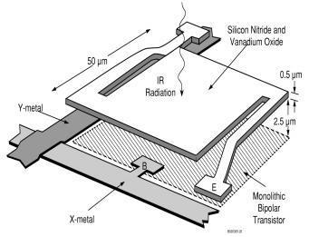 Individual sensor elements use the change in electrical resistance of a VOx resistor deposited onto the tiny “platelets” fabricated by silicon micro-machining in a silicon foundry. Incoming target radiation heats the VOx causing a change in electrical resistance, which is readout by measuring the resulting change in bias current. 80,000 and more sensors can be fabricated together into a two-dimensional array. The structure can be dimensioned to operate at 30 Hertz. That is, the thermal conductance of the isolating legs can be adjusted to match the time-constant for 30-hertz operation. An example of a microbolometer element is pictured below.