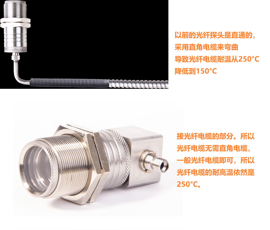 這樣我們就很容易理解直角光纖探頭的優點了,就是不再使用彎角光纖電纜,保證了光纖電纜耐溫250°C不變